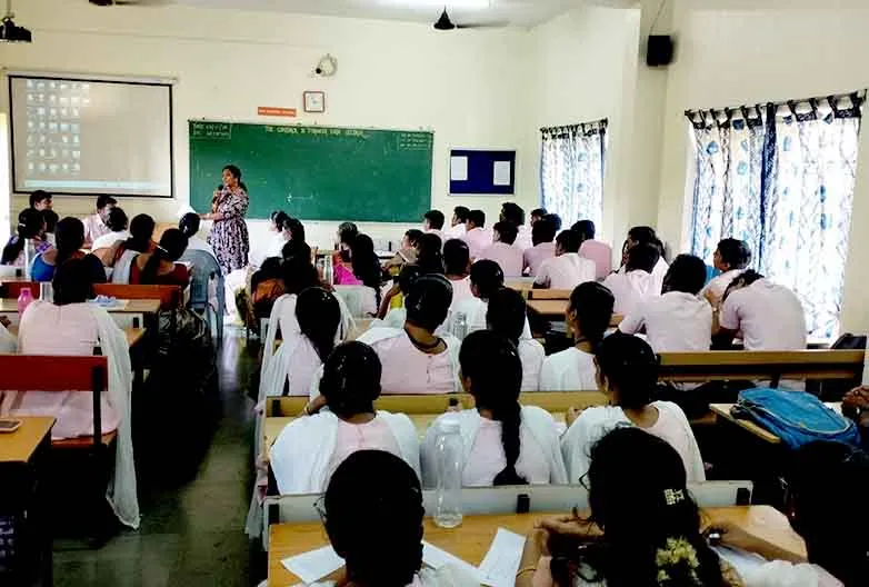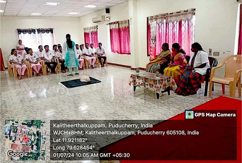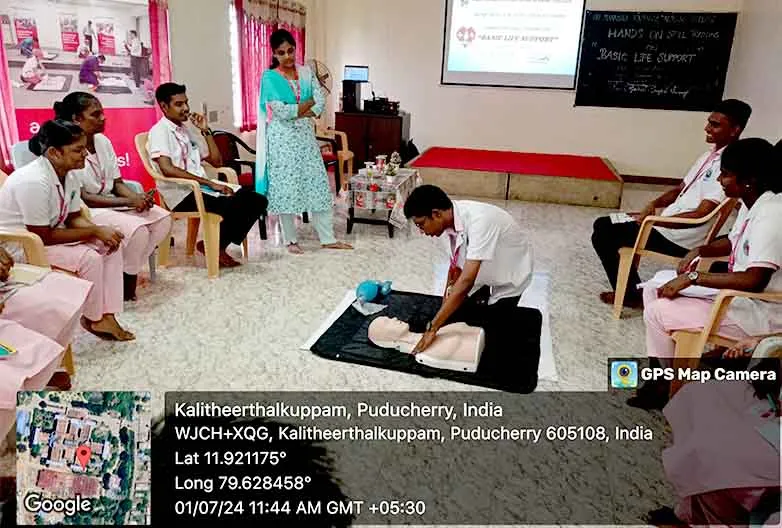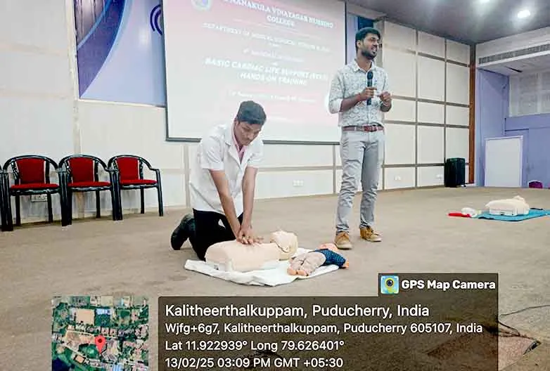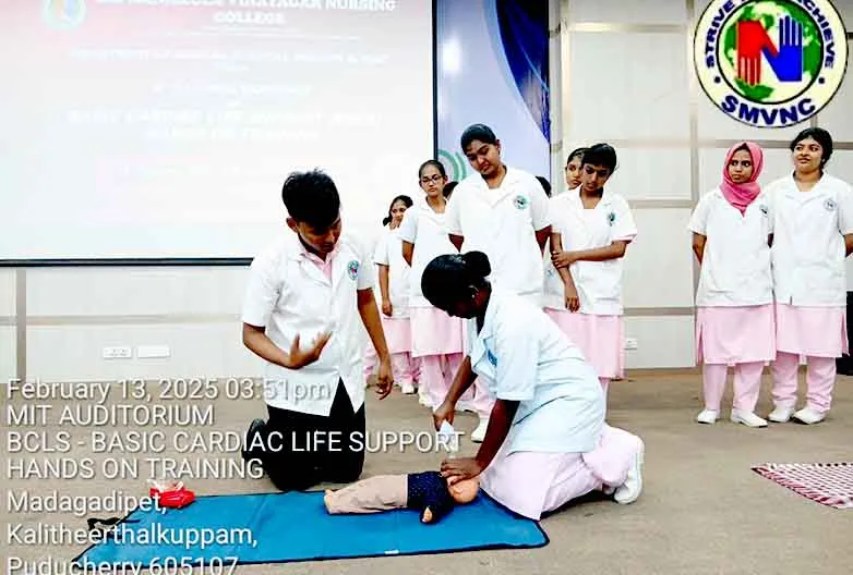 On 13th February, 2025, the 4th National Workshop on “Basic Cardiac Life Support – Hands on Training” was organized at College Auditorium. BCLS training was given by Dr. S. Kanagasabapathy, Trainer, Tamil Nadu Apex Training Centre for Healthcare, Chennai. Around 100 nursing students have got benefited from this training.