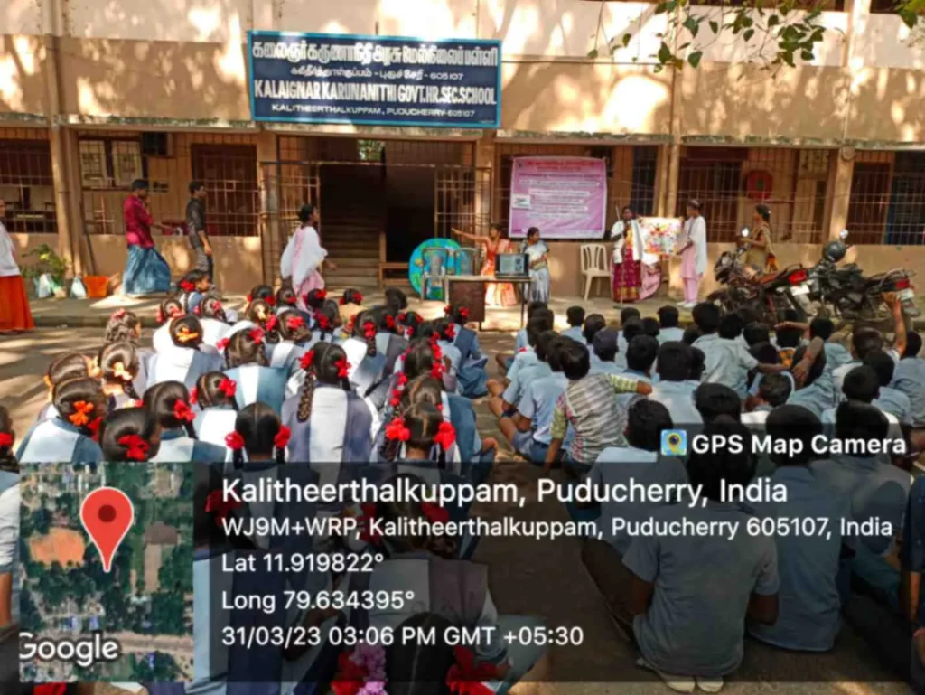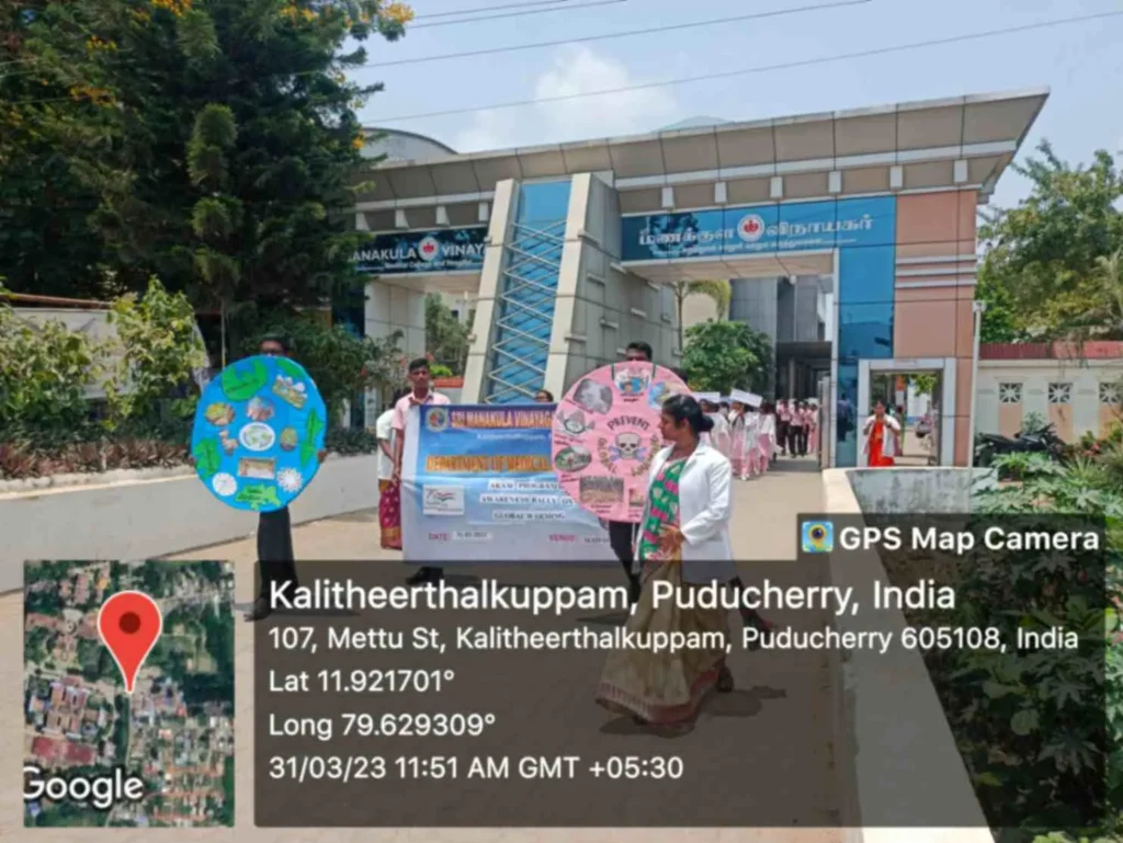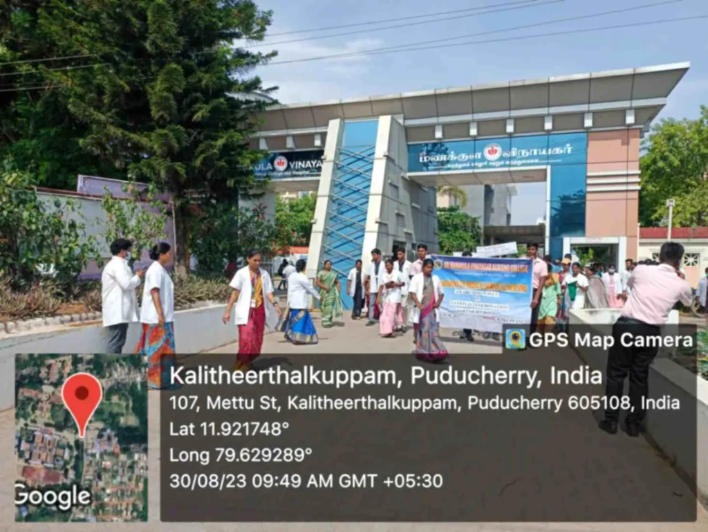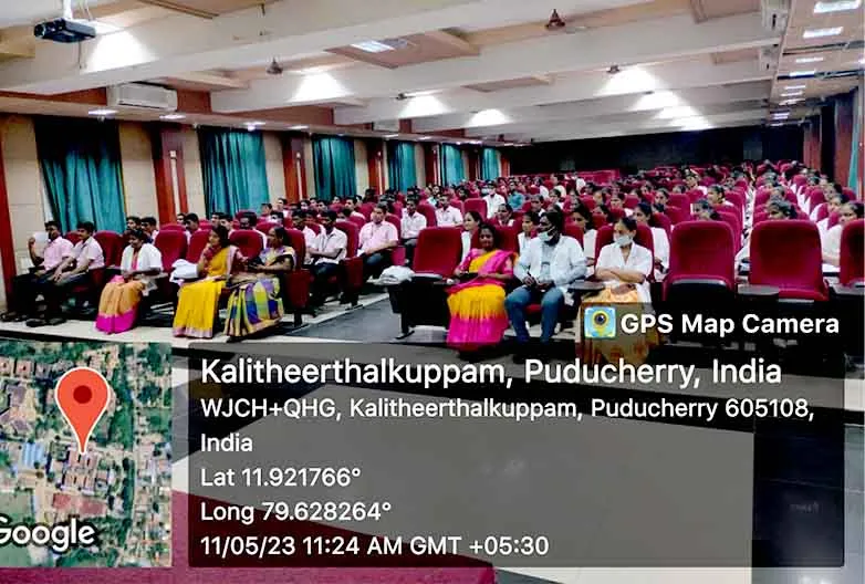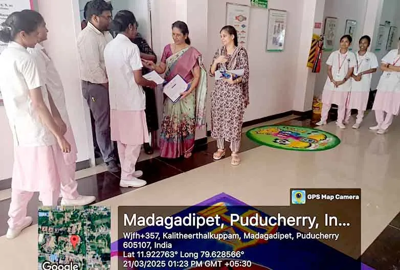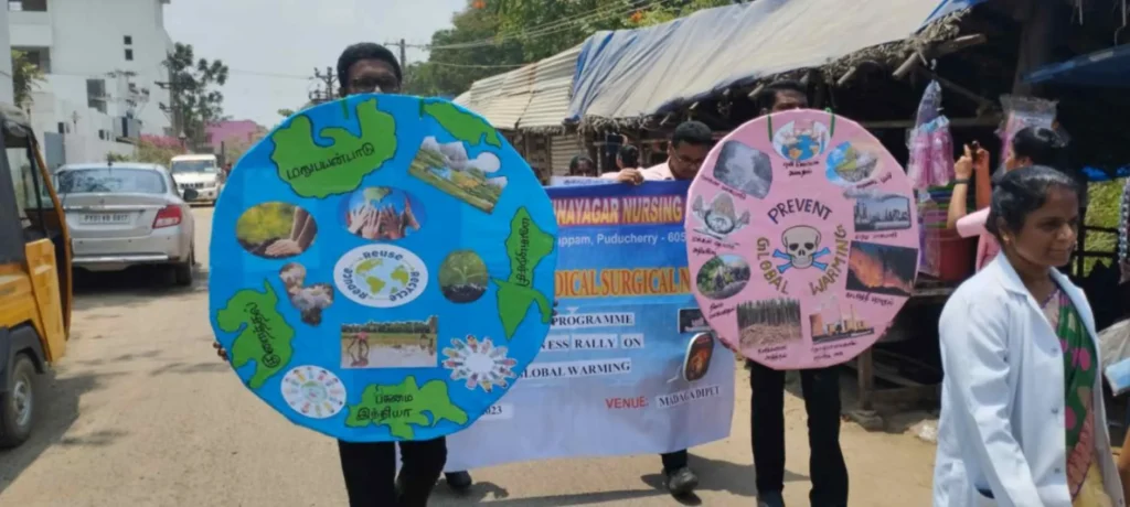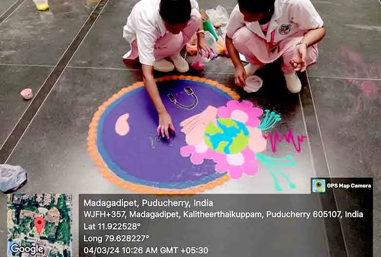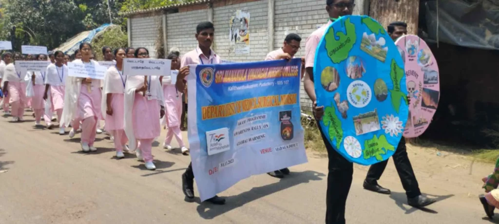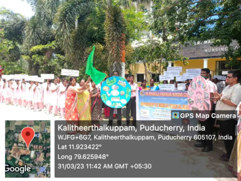 On 31st March 2023, under the theme Sustainable development under the concept of life, an awareness rally on Global warming, Tree plantation, Orientation programme on Health Schemes for Teachers, Role play on Hand hygiene, & Guest lecture on Importance of Quality education was organized at Kalaignar Karunanithi Govt. Higher Secondary School, Madagadipet, Puducherry. Around 100 nursing students participated and benefitted 150 school students, 10 school teachers, 300 public people