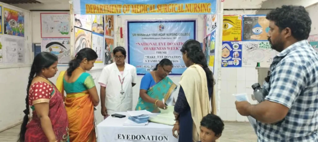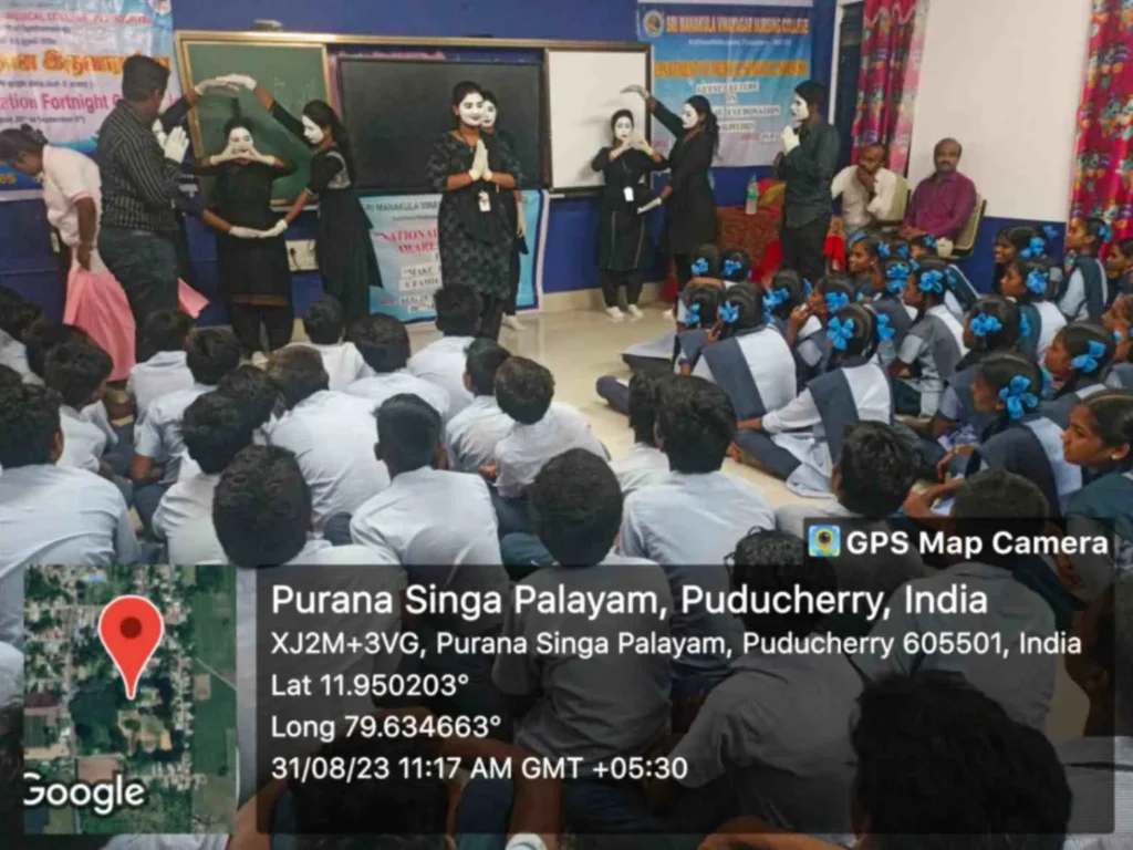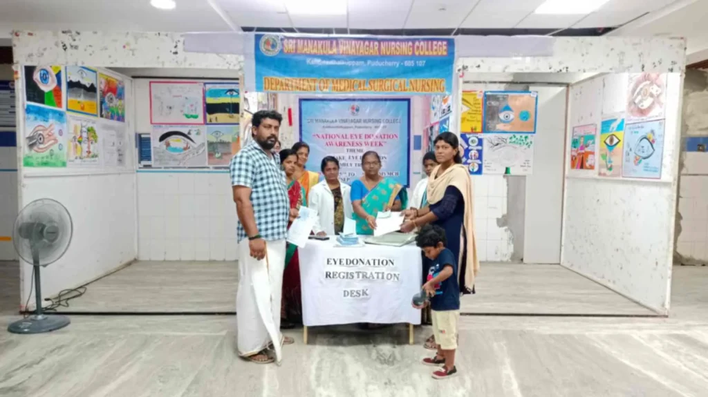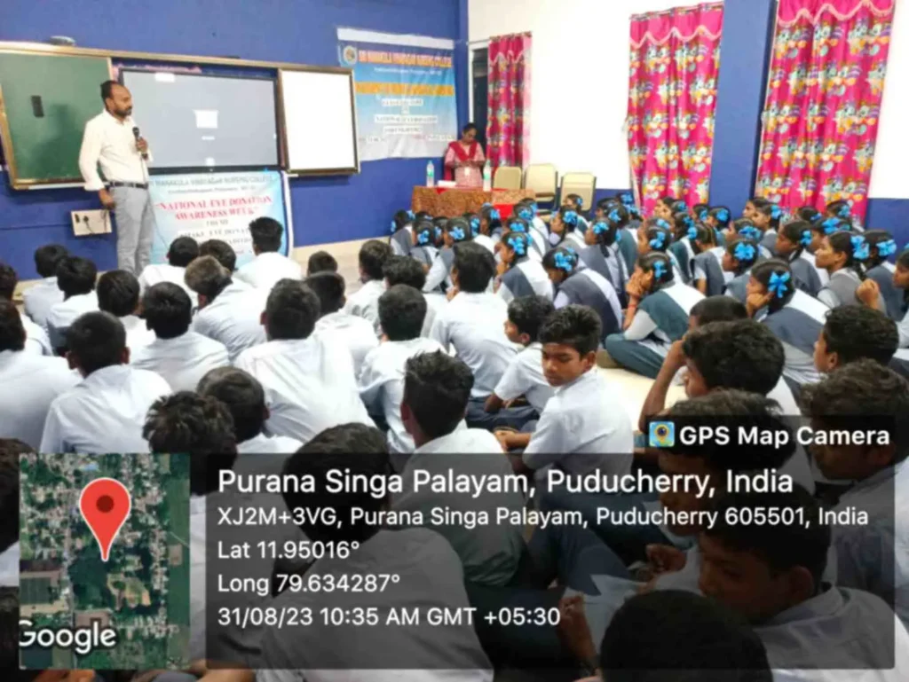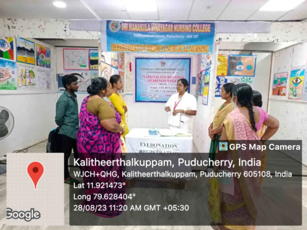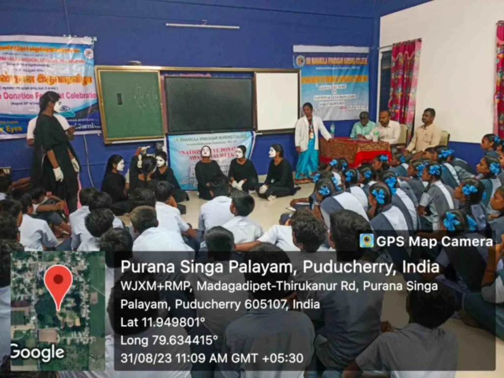 From 25th August to 8th September 2023, the National Eye donation Fortnight Week celebration was organized under the theme, “Make Eye donation, a family tradition”. Eye donation registration stall, awareness rally, Guest lecture on Importance of Eye donation by Dr. A. Sripal, Assistant Professor, Dept. of Ophthalmology, Slogan & Essay competition, and Mime show was carried out at our College campus and Pavendar Bharathidasan Hr. Sec. School, PS palayam. Around 100 nursing students participated, and 130 school students, 10 school teachers, 300 public got benefitted through this programme.