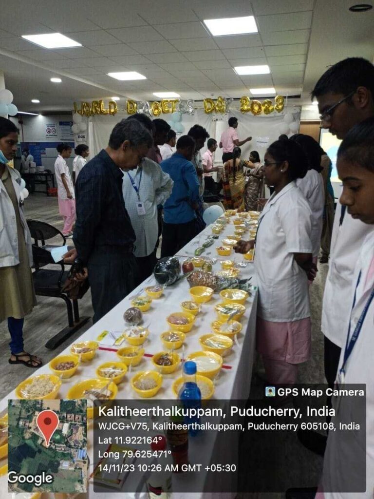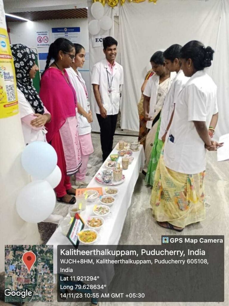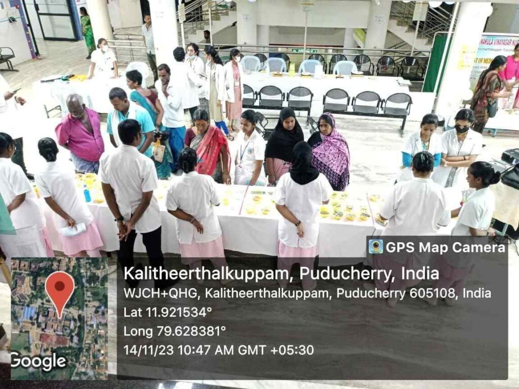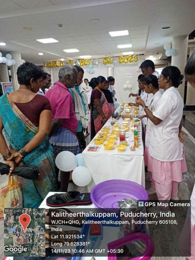 In commemoration of World Diabetes Day, Health stall regarding Diabetic diet, diabetic foot care, and diabetic screening and Awareness rally, Cooking without fire competition was conducted from 14th – 18th November 2023 at SMVMCH. Around 100 nursing students participated, 300 public people got benefitted through this programme.