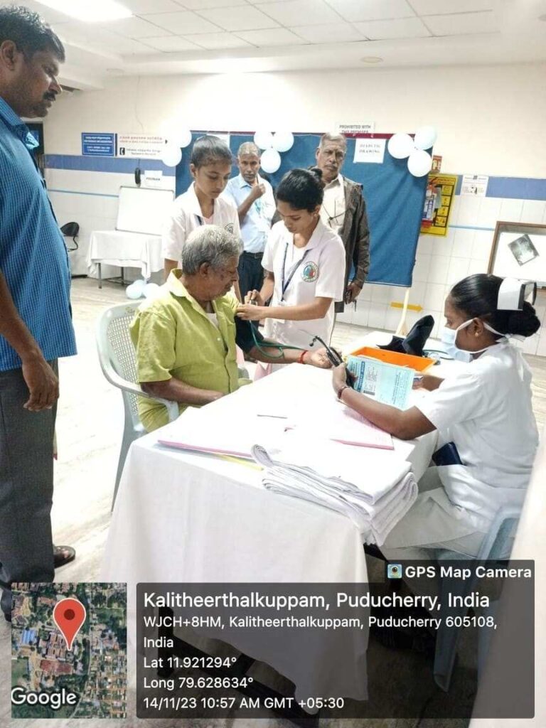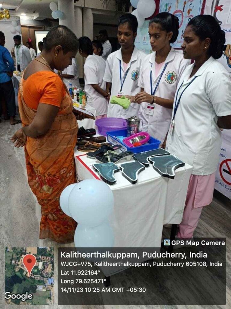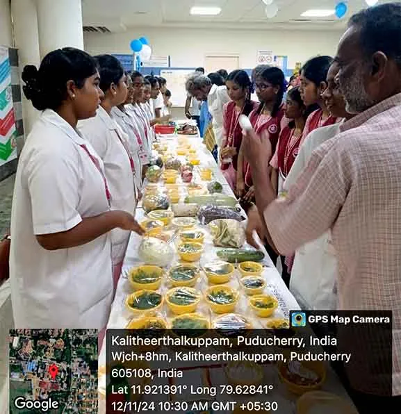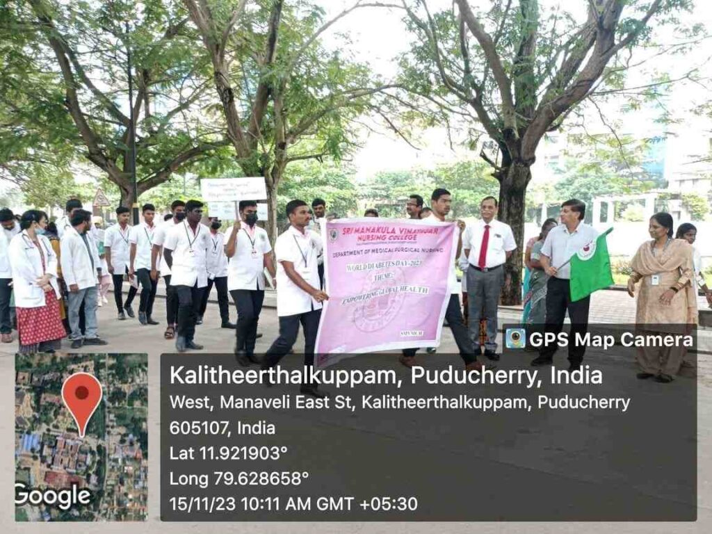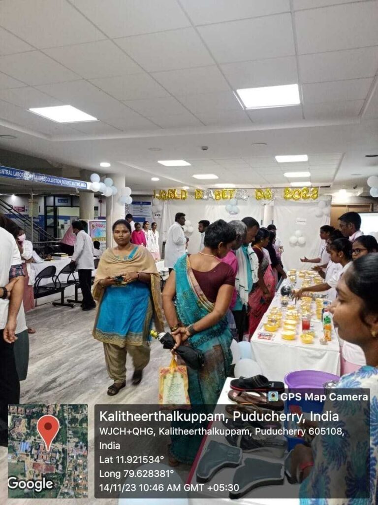 In commemoration of World Diabetes Day, Health stall regarding Diabetic diet, diabetic foot care, and diabetic screening and Awareness rally, Cooking without fire competition was conducted from 14th – 18th November 2023 at SMVMCH. Around 100 nursing students participated, 300 public people got benefitted through this programme.