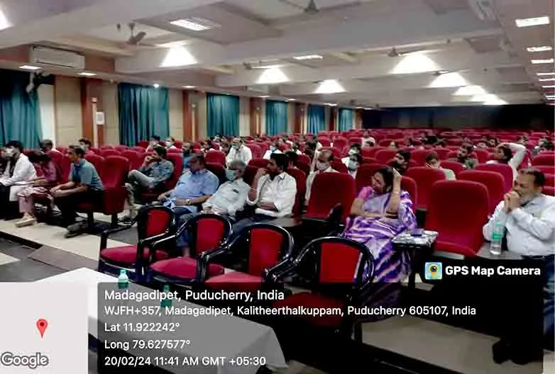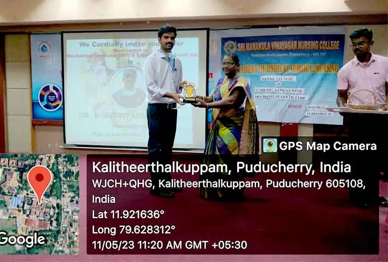 On 11th May 2023, a Guest lecture on Care of patient on Mechanical ventilator was carried out by Dr. R. Srinivasan, MD, DNB, PDCC (Critical care), Associate. Prof, Dept. of Anesthesiology, SMVMCH at SMVMCH Basement auditorium. Around 170 nursing students participated and got benefitted through this lecture.