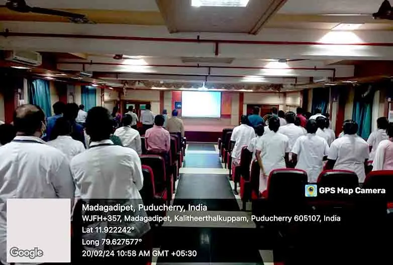 On 20th February 2024, in commemoration of “World Cancer Day” a Guest lecture on the topic “Eliminating provoking factors for Lung Cancer” was carried out by Dr. S. Yuvarajan, HOD, Dept. of Respiratory medicine, SMVMCH at SMVMCH Basement auditorium. Around 105 nursing students gained awareness through this programme.