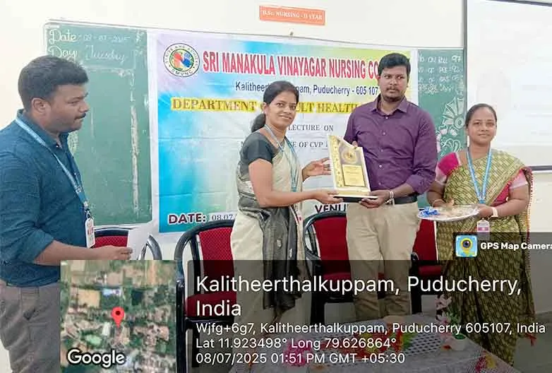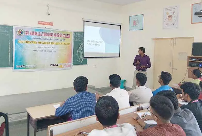 On 8th July, 2025, Guest Lecture on “Maintenance of CVP Line” was carried out by Dr. Vijayakumar, Asst. Prof, Dept. of Anesthesia, AVMCH at Lecture hall, SMVNC. Around 100 students benefitted through this lecture.