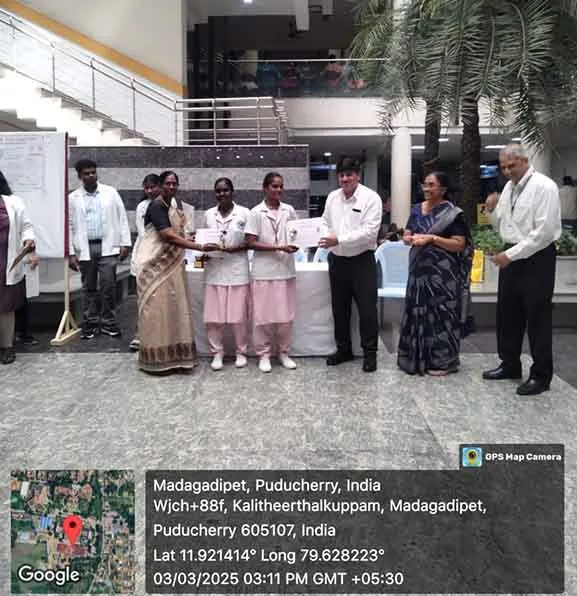 On 24th March, 2025, Best TB Awareness Creator Contest on “Unite to End Tuberculosis” was conducted at Pulmo OPD, SMVMCH. Winners of the contest Ms. Yazhini. R, Ms. Keerthana. S, Ms. Malathi. P were appreciated and awarded. Around 200 public people have got benefited through this programme.