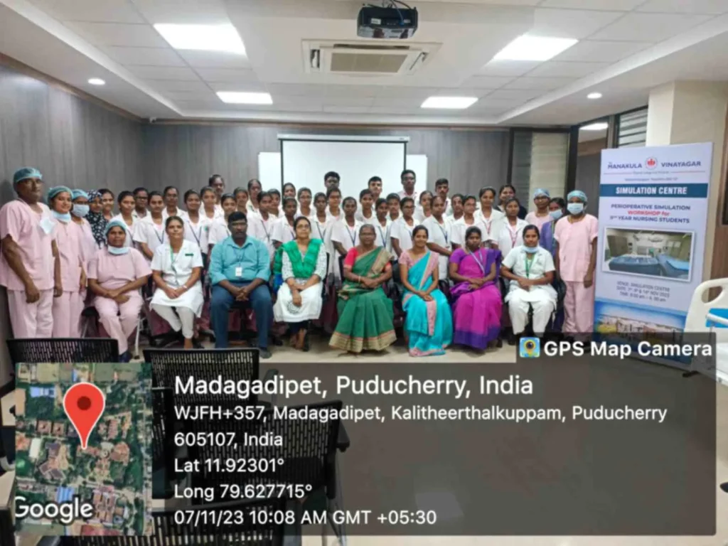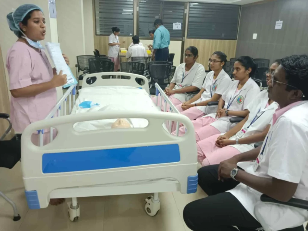 On 3rd July 2024, “Hands on training – Simulation” (Management of a patient with Hypovolemic shock) was organized at Seminar Hall, SMVNC. DR. Judie Arulappan, Certified Healthcare Simulation Educator, Sultan Qaboos University supervised and provided feedback. Around 400 nursing students received training on Simulation.