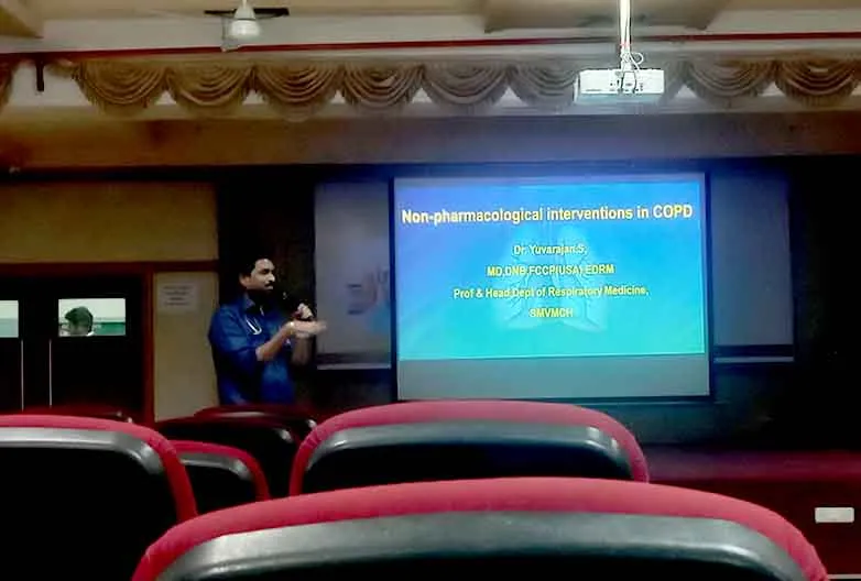 On 15th November 2023, in commemoration of World COPD Day, a Guest lecture on “Non Pharmacological management of COPD” was carried out by Dr. S. Yuvarajan, HOD, Dept. of Respiratory medicine, SMVMCH at college auditorium. 100 nursing students participated and got benefitted through this programme.